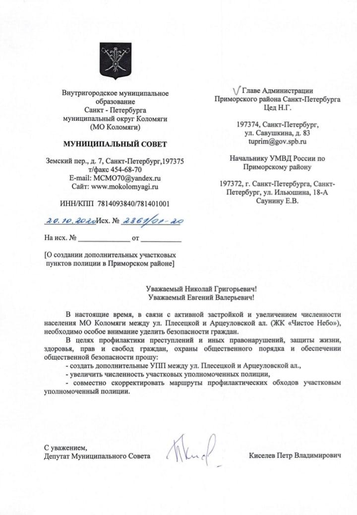 Депутат МС МО Коломяги Петр Владимирович Киселев отправил обращение относительно организации Участкового пункта полиции (УПП) на территории ЖК "Чистое Небо".