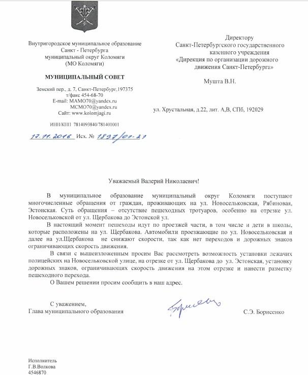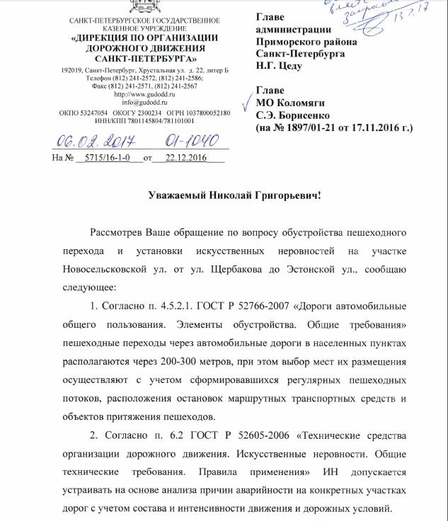 Ответ на обращение по поводу отсутствия пешеходных тротуаров, в том числе на отрезке ул. Новосельковской от ул. Щербакова до ул. Эстонской