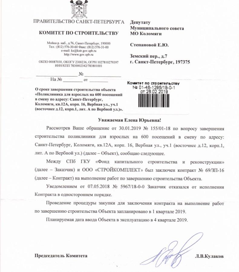 В редакцию газеты «Коломяжские вести» обратились жители с просьбой узнать точную дату открытия долгостроя. В Комитет по строительству Санкт-Петербурга был отправлен запрос, с просьбой узнать судьбу поликлиники.