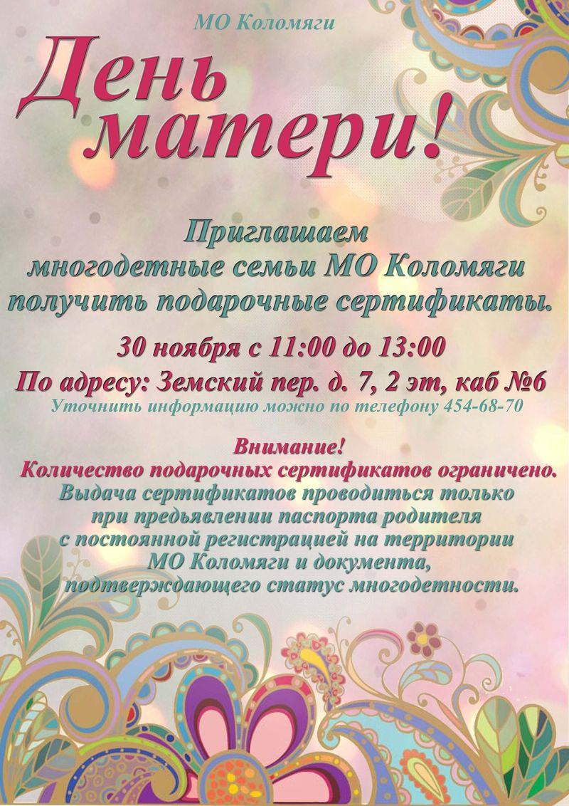 Подарочные сертификаты многодетным семьям ко Дню матери