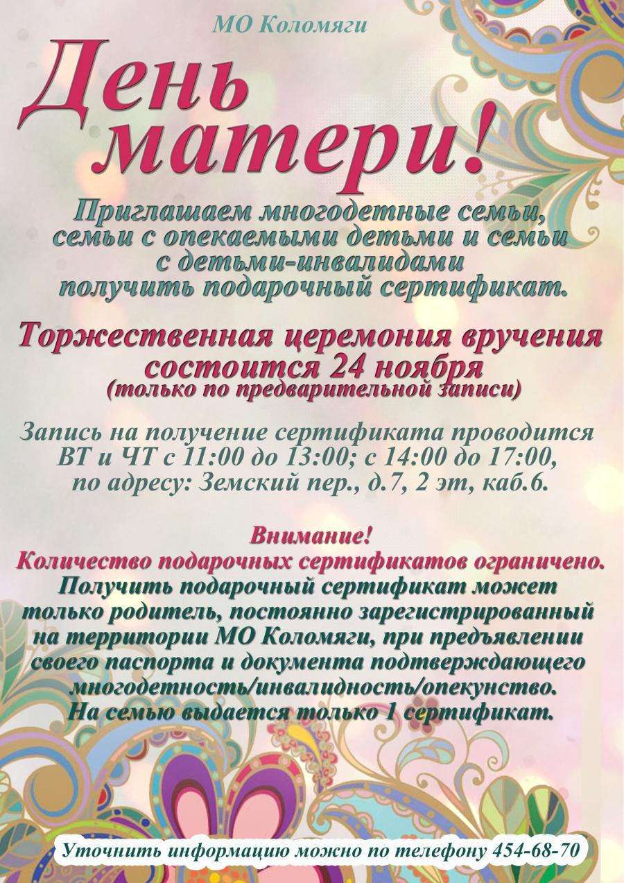 Подарочные сертификаты многодетным семьям ко Дню матери
