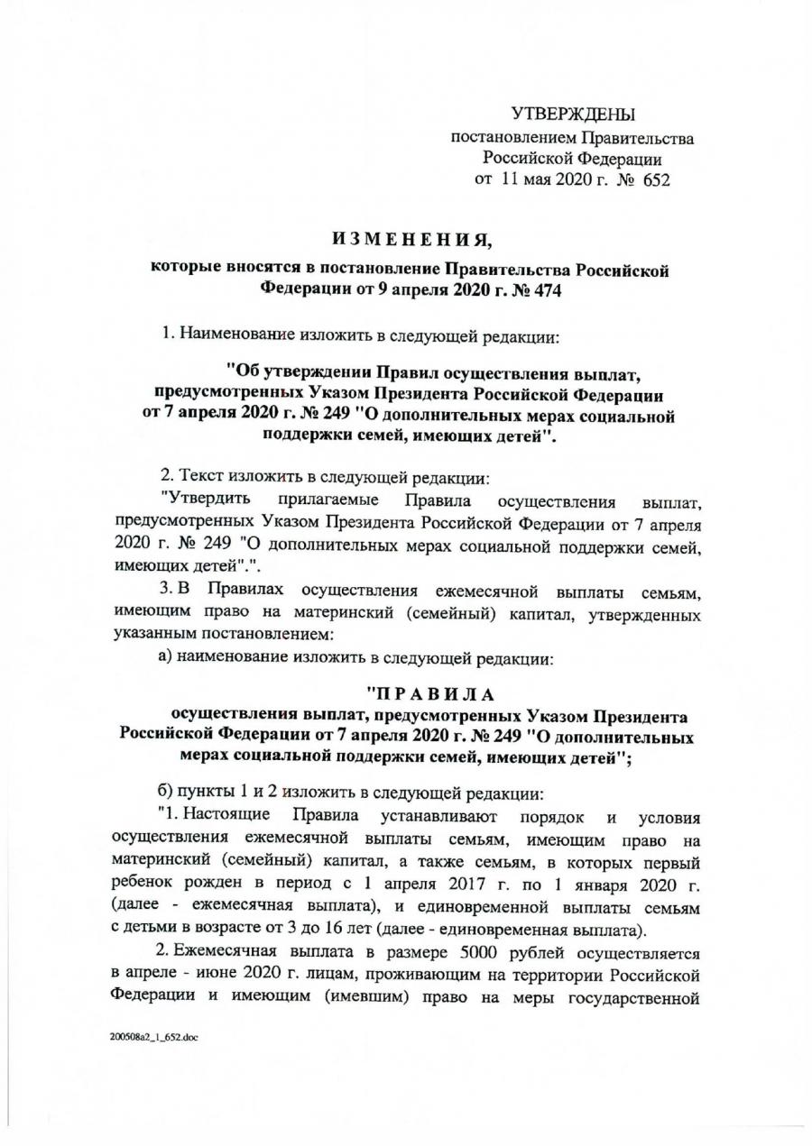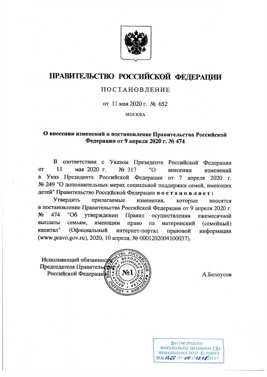 Постановление Правительства Российской Федерации от 11.05.2020 №652 "О внесении изменений в Постановление Правительства Российской Федерации от 09.04.2020 №474"