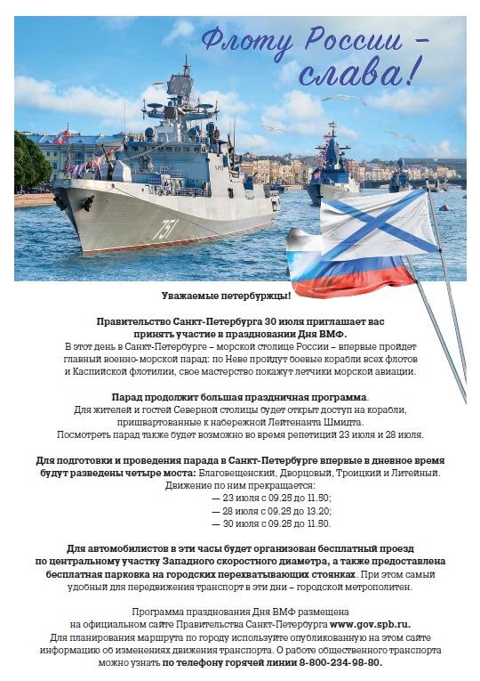 Правительство Санкт-Петербурга 30 июля приглашает принять участие в праздновании Дня ВМФ