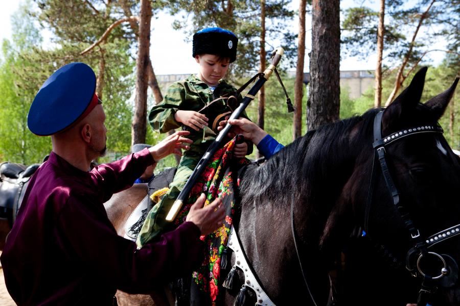 Согласно обычаю, в этот торжественный день казачат при благословлении священника сажают в седло, а старшие казаки соревнуются