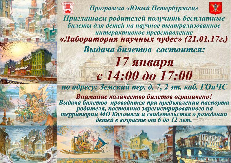 17 января приглашаем получить билеты на научное театрализованное представление в "Лабораторию научных чудес" по адресу: СПб, Земский пер., д.7, 2 этаж, кабинет ГО и ЧС.
