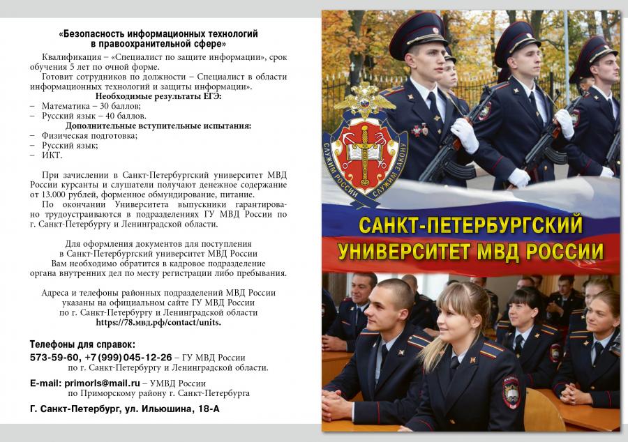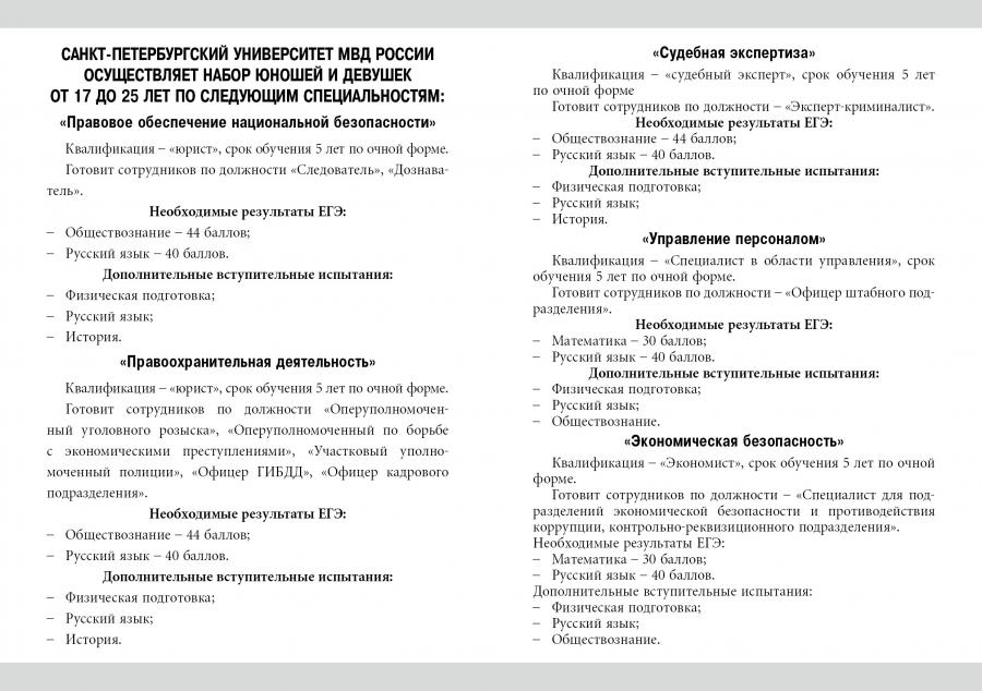 Санкт-Петербургский университет МВД осуществляет набор юношей и девушек по следующим специальностям