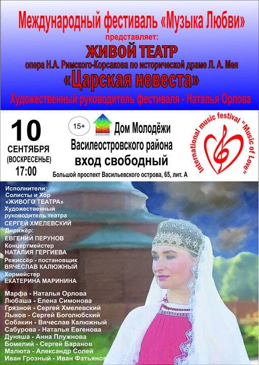 Приглашаем на премьеру оперного спектакля "Царская Невеста" в это воскресенье во дворец Молодёжи на Васильевском острове (Большой проспект, 65) в 17.00, 10 сентября. Этот спектакль вскоре будет представлен и европейской публике в Финляндии.