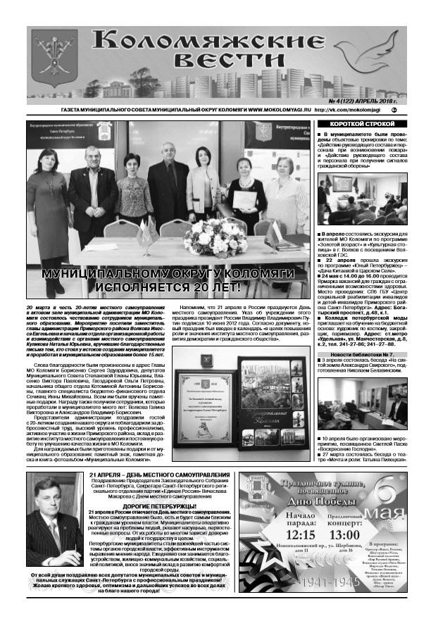 Свежий номер газеты "Коломяжские вести" - апрель, 2018