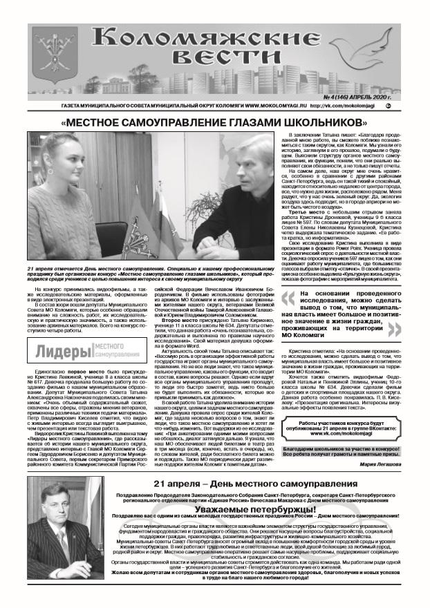 Свежий номер газеты "Коломяжские вести" - апрель, 2020