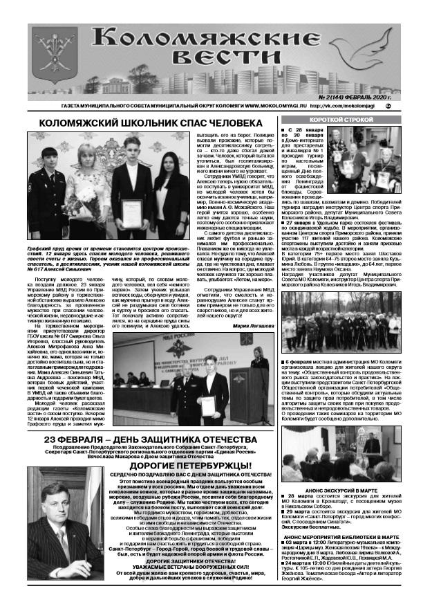 Свежий номер газеты "Коломяжские вести" - февраль, 2020