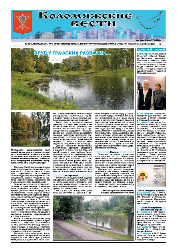 Свежий номер газеты "Коломяжские вести" - март, 2020