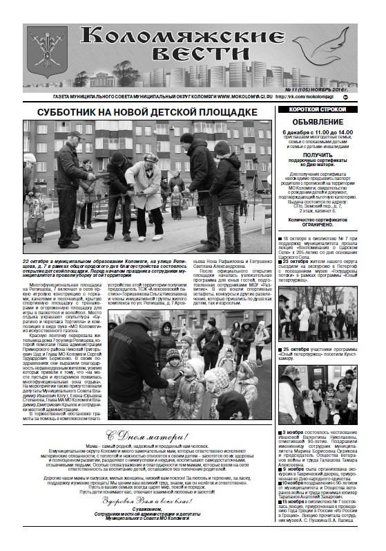 Уважаемые читатели, на сайте размещен свежий номер газеты "Коломяжские вести", ноябрь, 2016 - mokolomyagi.ru/files/file/Gazeta_11_16.pdf