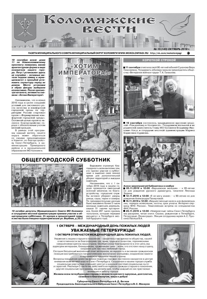 Свежий номер газеты "Коломяжские вести" - Октябрь, 2019