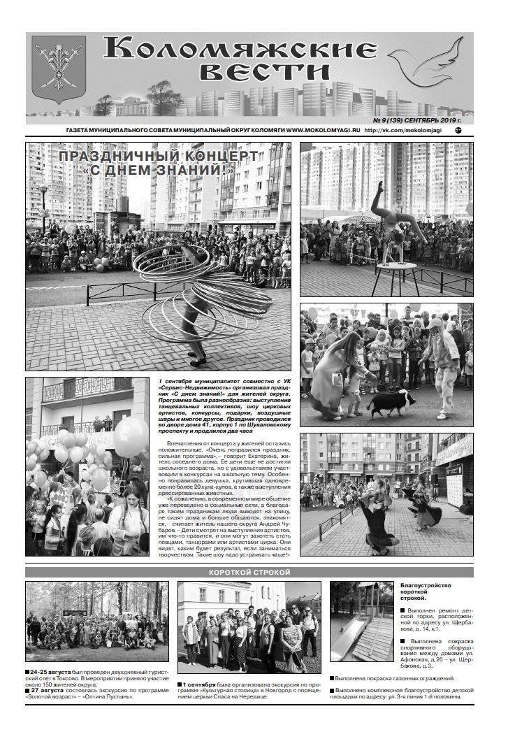 Свежий номер газеты "Коломяжские вести" - Сентябрь, 2019