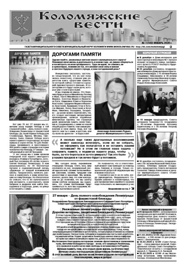 Свежий номер газеты "Коломяжские вести" - январь, 2020