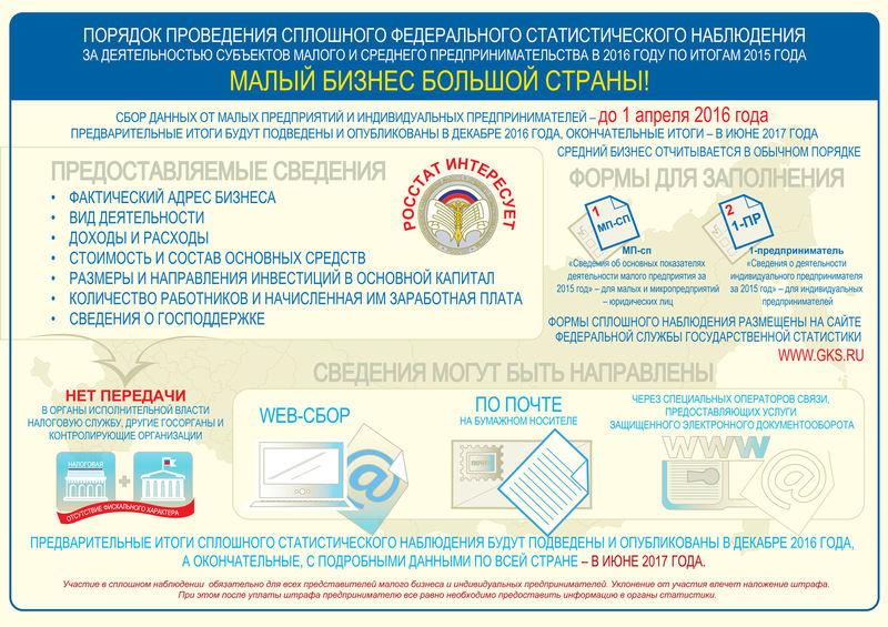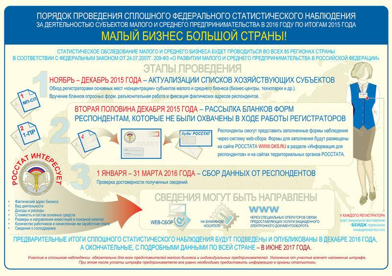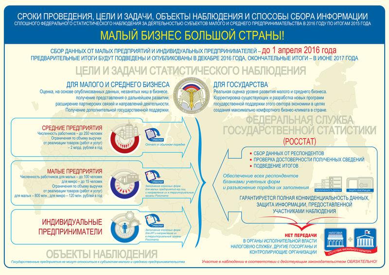 В соответствии с Федеральным законом от 24.07.2007 №209-ФЗ «О развитии малого и среднего предпринимательства в Российской Федерации» в 2016 году Росстат проведет сплошное федеральное статистическое наблюдение за деятельностью субъектов малого и среднего предпринимательства по итогам 2015 года (сплошное наблюдение).