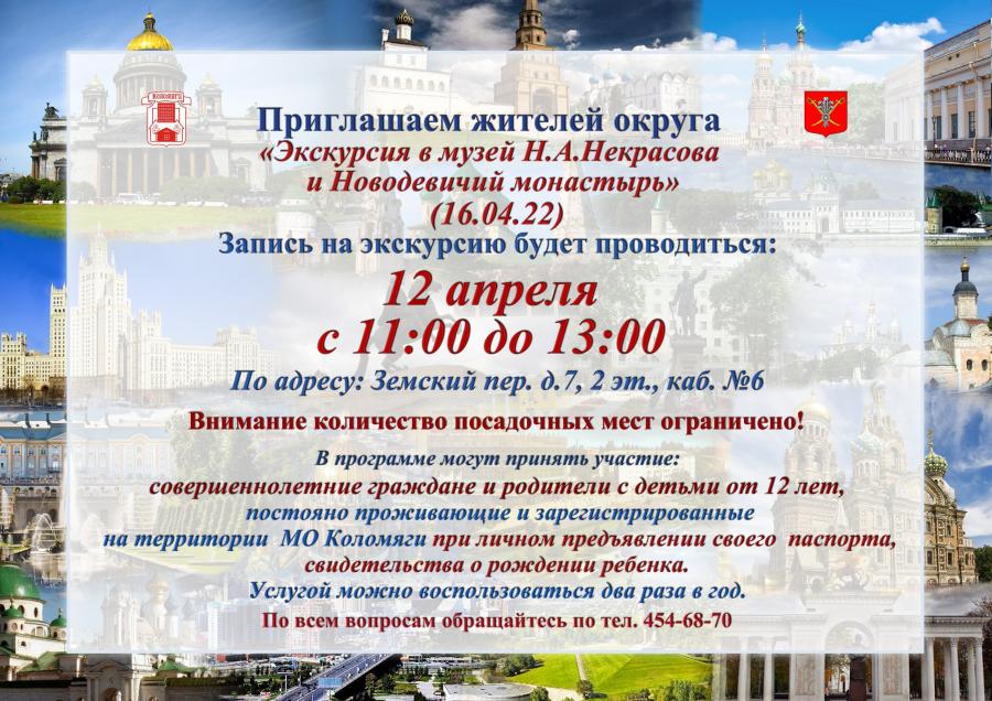 Уважаемые жители МО Коломяги, приглашаем 12.04. с 11:00 записаться на  бесплатную автобусную экскурсию «Экскурсия в музей Н.А.Некрасова и  Новодевичий монастырь»