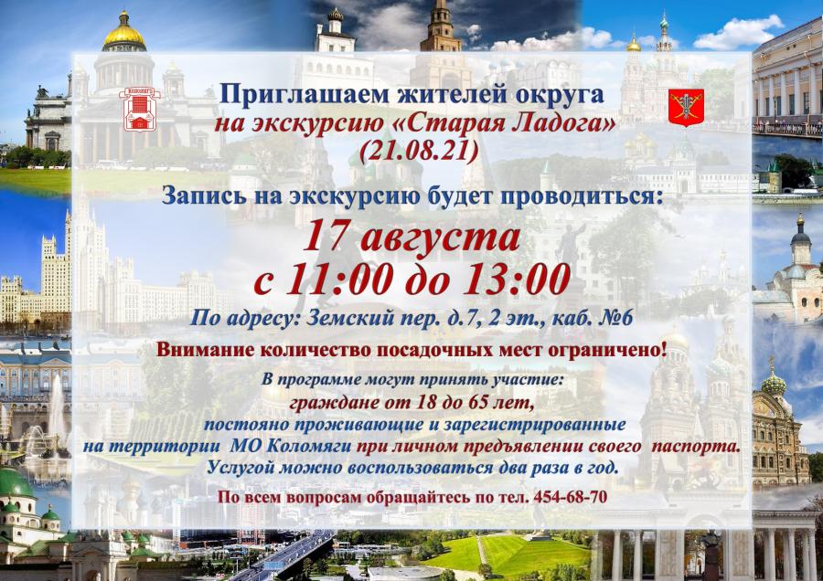 В связи с эпидемиологической обстановкой, запись на экскурсии для жителей МО Коломяги будет проводиться дистанционно с 11:00 17.08.21г. только для граждан 18-65 лет.