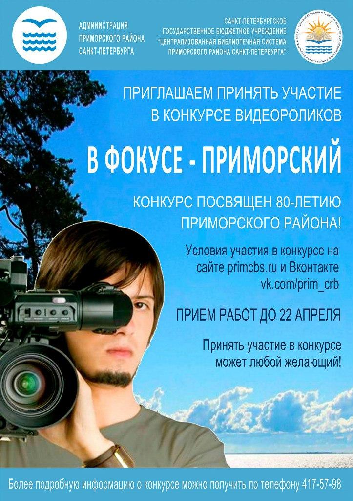 «В фокусе – Приморский» – конкурс видеороликов о Приморском районе, участником которого может стать любой житель района независимо от возраста, пола, рода занятий и увлечений. Победа будет присуждаться в двух номинациях: «Презентация» (видеоролик из фотографий) и «Видеосюжет» (видео). Для конкурсантов предложены темы: «Страницы истории Приморского района»; «Недаром Приморским зовется» (морская тематика в районе); «Здесь читают даже птицы» (чтение и культура); «Люди и лица Приморского района» (повседневная жизнь); «Самый живописный уголок района»; «Мое любимое место в районе»; «Приморский район – спортивный район»; «Приморский район – детям»; «Приморский район – студенческий район».