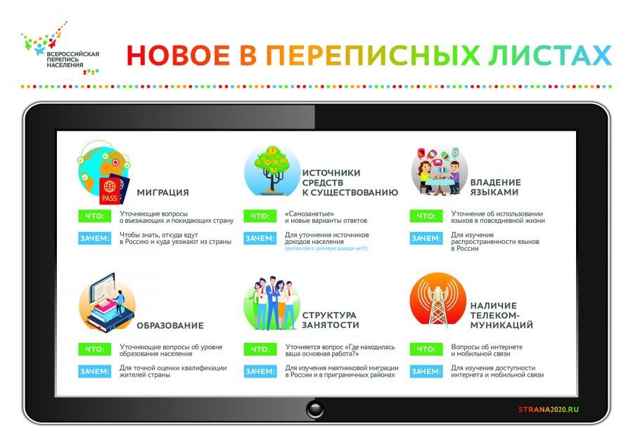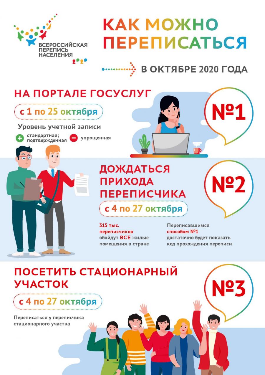 Всероссийская перепись населения пройдет с 1 по 30 апреля 2021 года с применением цифровых технологий. Главным нововведением предстоящей переписи станет возможность самостоятельного заполнения жителями России электронного переписного листа на портале Госуслуг (Gosuslugi.ru). При обходе жилых помещений переписчики будут использовать планшеты со специальным программным обеспечением. Также переписаться можно будет на переписных участках, в том числе в помещениях многофункциональных центров оказания государственных и муниципальных услуг «Мои документы».