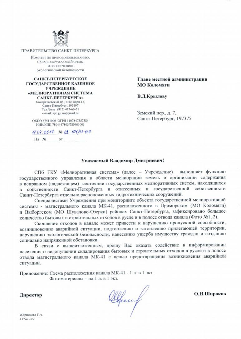 Специалистами СПб ГКУ "Мелиоративая система" при мониторинга объекта МК-41, расположенного на территории МО Коломяги и Шувалово-Озерки зафиксировано большое количество бытовых и строительных отходов. Это может привести к аварийной ситуации.
