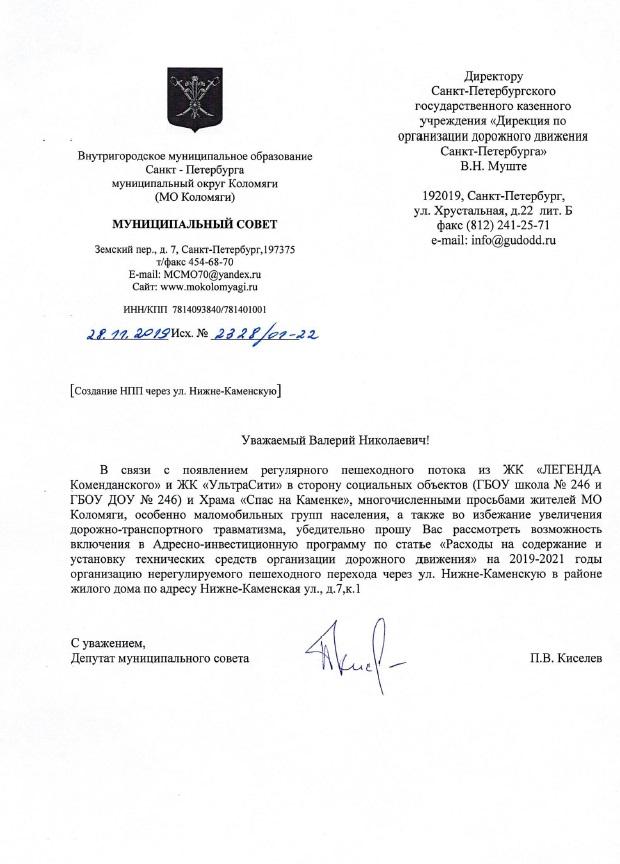 Запрос депутата Муниципального Совета Киселева П.В. о создании нерегулируемого пешеходного перехода через улицу Нижне-Каменскую.