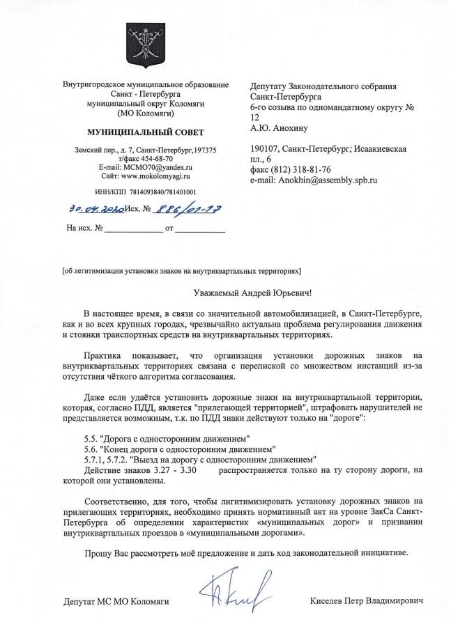 > Обращения > Запросы депутатов Муниципального Совета > Запросы 2020 год > Обращение по легитимизации установки дорожных знаков на внутриквартальных территориях