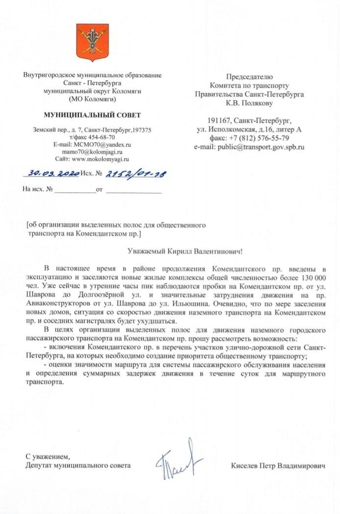 > Обращения > Запросы депутатов Муниципального Совета > Запросы 2020 год > Отправлены обращения для увеличения скорости движения транспорта на Комендантском пр. и пр. Авиаконструкторов (запрет парковки и организация выделенных полос для общественного транспорта)