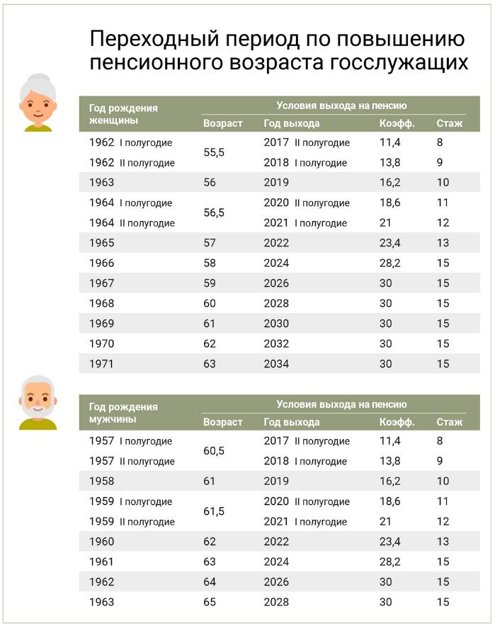 С 2019 года государственным служащим страховая пенсия по старости назначается в соответствии частью 1.1 статьи 8 Федерального закона № 400-ФЗ, по достижении ими в соответствующем году возраста, указанного в приложении 5 к названному Федеральному закону.