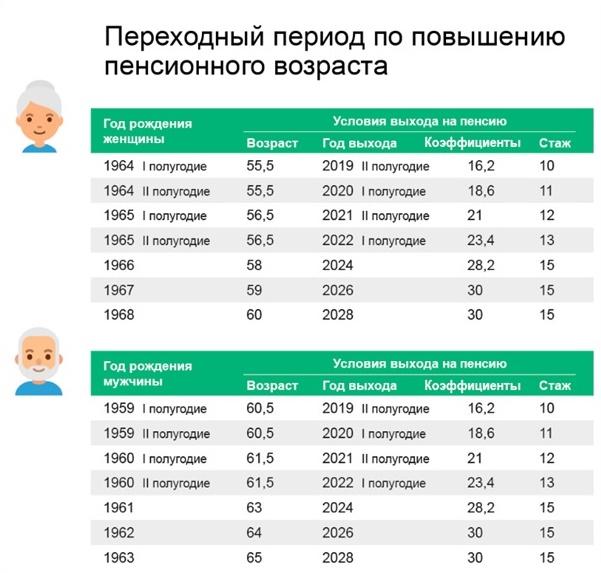В настоящее время происходит постепенное повышение пенсионного возраста. Таким образом, эти два года нужно отнимать от пенсионного возраста, установленного для конкретного года рождения мужчины или женщины.