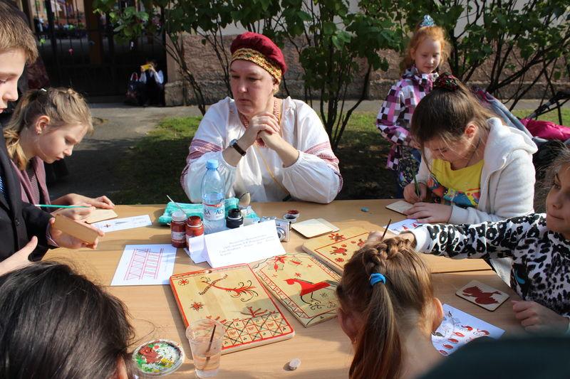 Преподаватель ИЗО, черчения и искусства, к.п.н. Наталья Петровна Лукк проводит мастер-класс по мезенской росписи. Ее ученица на деревянной доске нарисовала символичный узор, где волнистая линия означает мать — сыру землю, дуги — небо с облаками, а дерево — цветущий сад. По словам учителя, это самая древняя роспись, возникшая на территории Архангельской области, в городе Мезень. Первые найденные образцы датируются тем же временем, что и древнегреческие амфоры. Орнаменты в этой технике выполняются в двух цветах — черном и красном. Эту роспись наносили на мебель, сани, солонки, шкатулки. Сегодня на уроке с ее помощью украшают разделочные доски. Желающих попробовать свои силы в мастер-классе было очень много, но материала хватило только 20 ученикам. Но пусть не все смогли унести с собой домой собственноручно изготовленный предмет кухонной утвари, гораздо важнее, что благодаря фестивалю каждый узнал что-то новое о своей собственной культуре и о традициях других народов.
