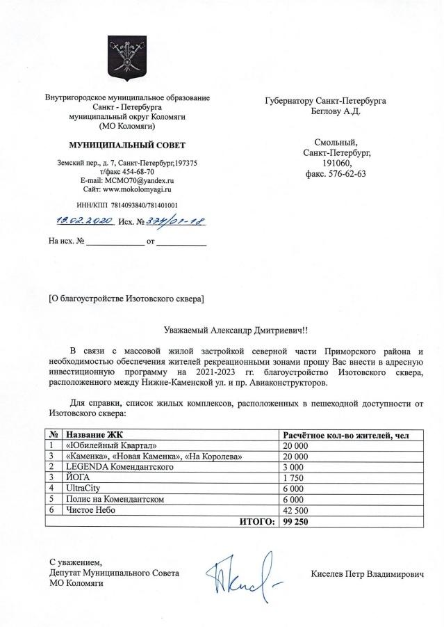 > Обращения > Запросы депутатов Муниципального Совета > Запросы 2020 год > Повторное обращение Губернатору Санкт-Петербурга по вопросу благоустройства Изотовского сквера.